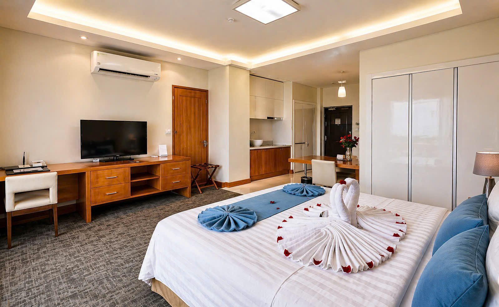 • Convenience: Mini fridge, kettle, hair dryer, and complimentary bottled water.